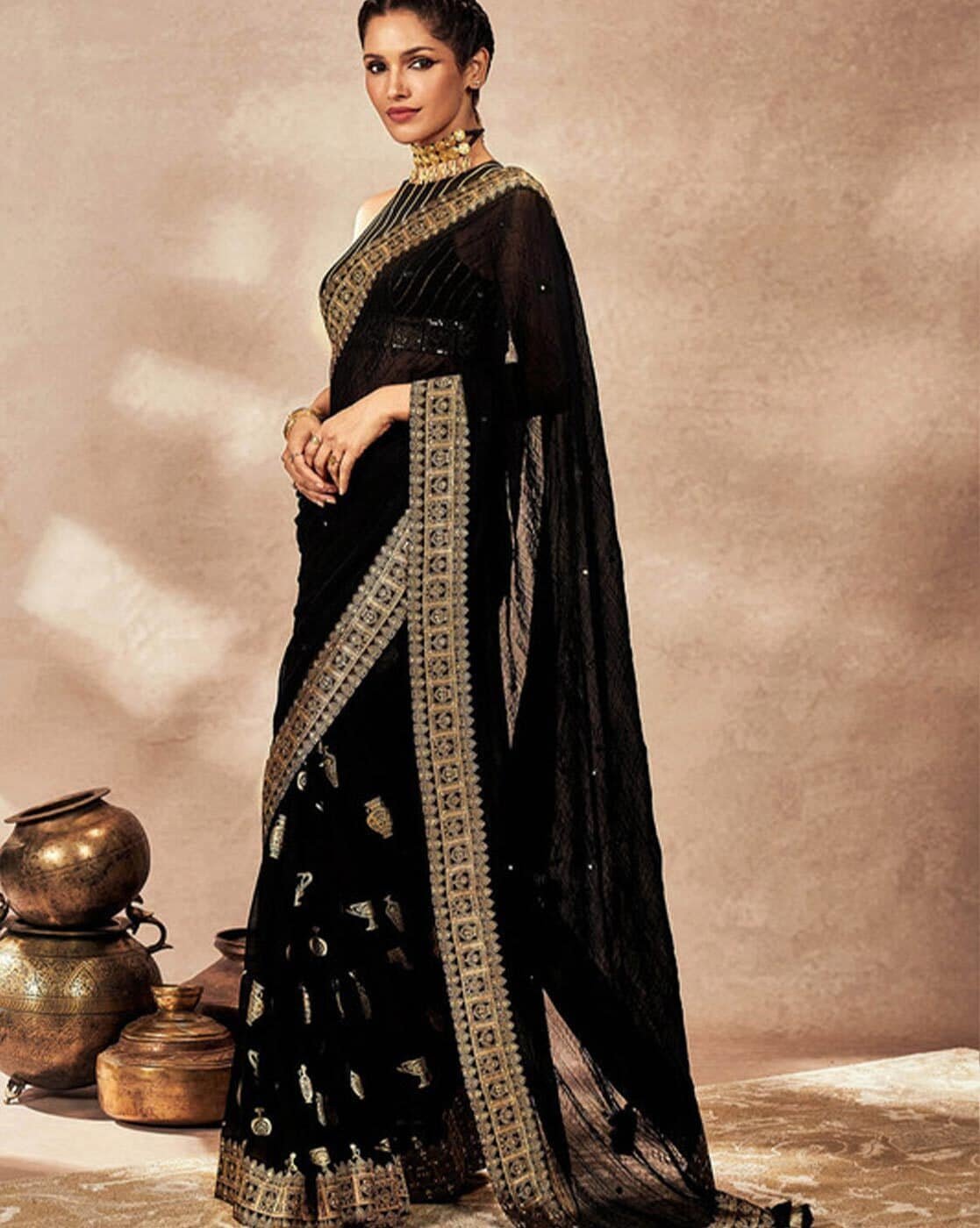 The last image gives a detailed look of the blouse piece that comes with this saree (The model is wearing a blouse from our in-house wardrobe)